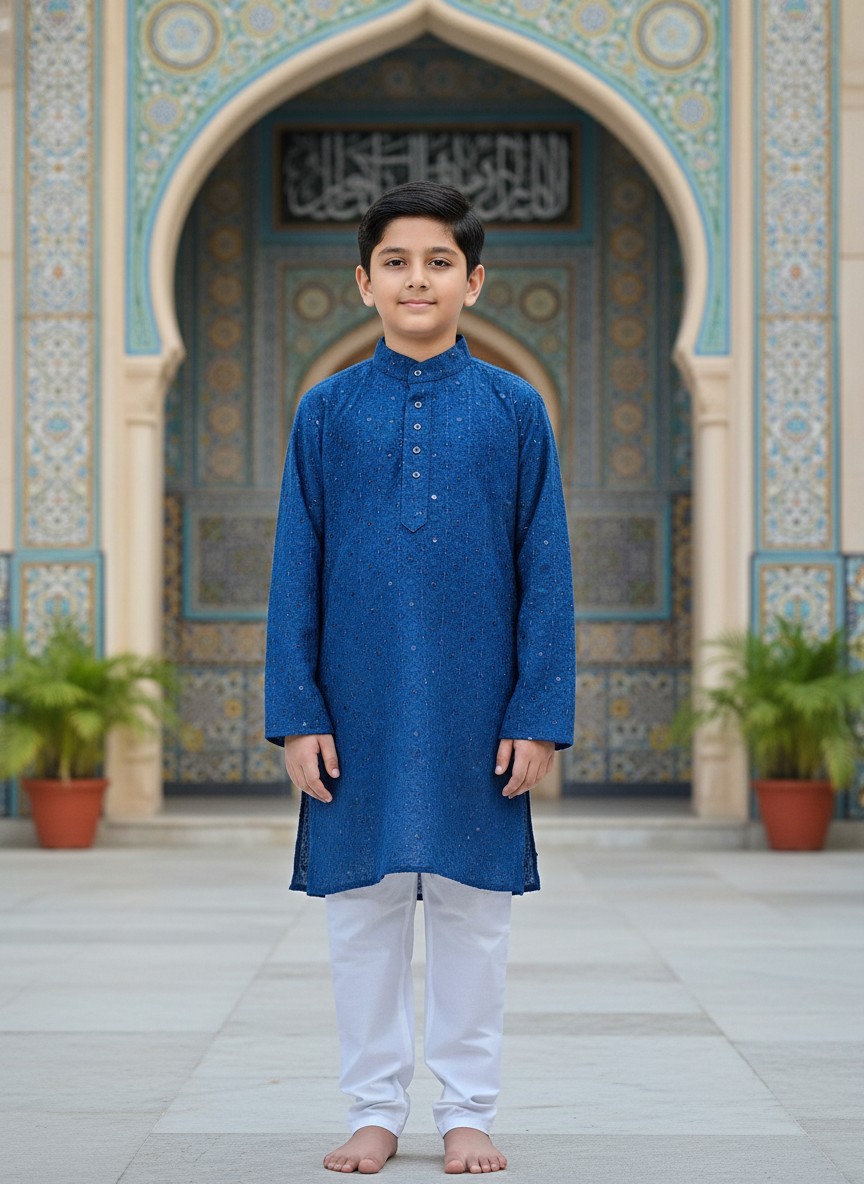 Boys Pathani Kurta Pajama Set. Crafted from soft, breathable fabric, this outfit ensures all-day comfort while maintaining a rich traditional look.
