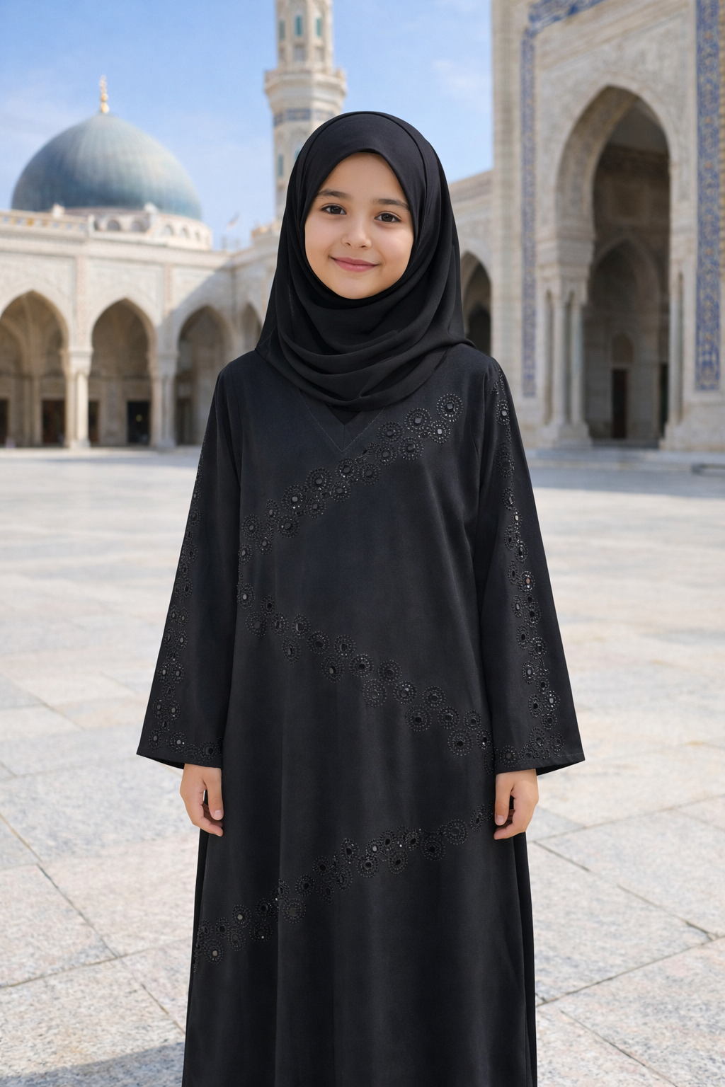 A beautifully embroidered girls’ abaya that adds charm and elegance to modest dressing. The fine stoneworks enhances the overall look while keeping the design simple and child-friendly.