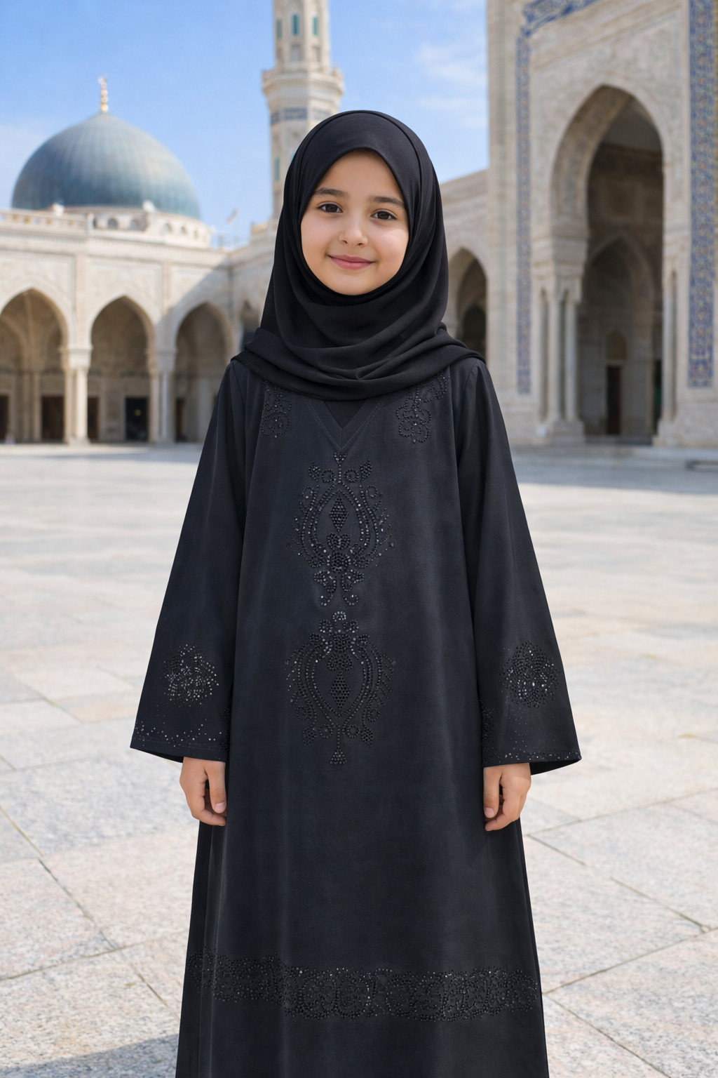 This stylish girls’ abaya is highlighted with minimal stone detailing for a clean and elegant look. Designed for comfort and ease, it is suitable for both casual outings and semi-formal events.
