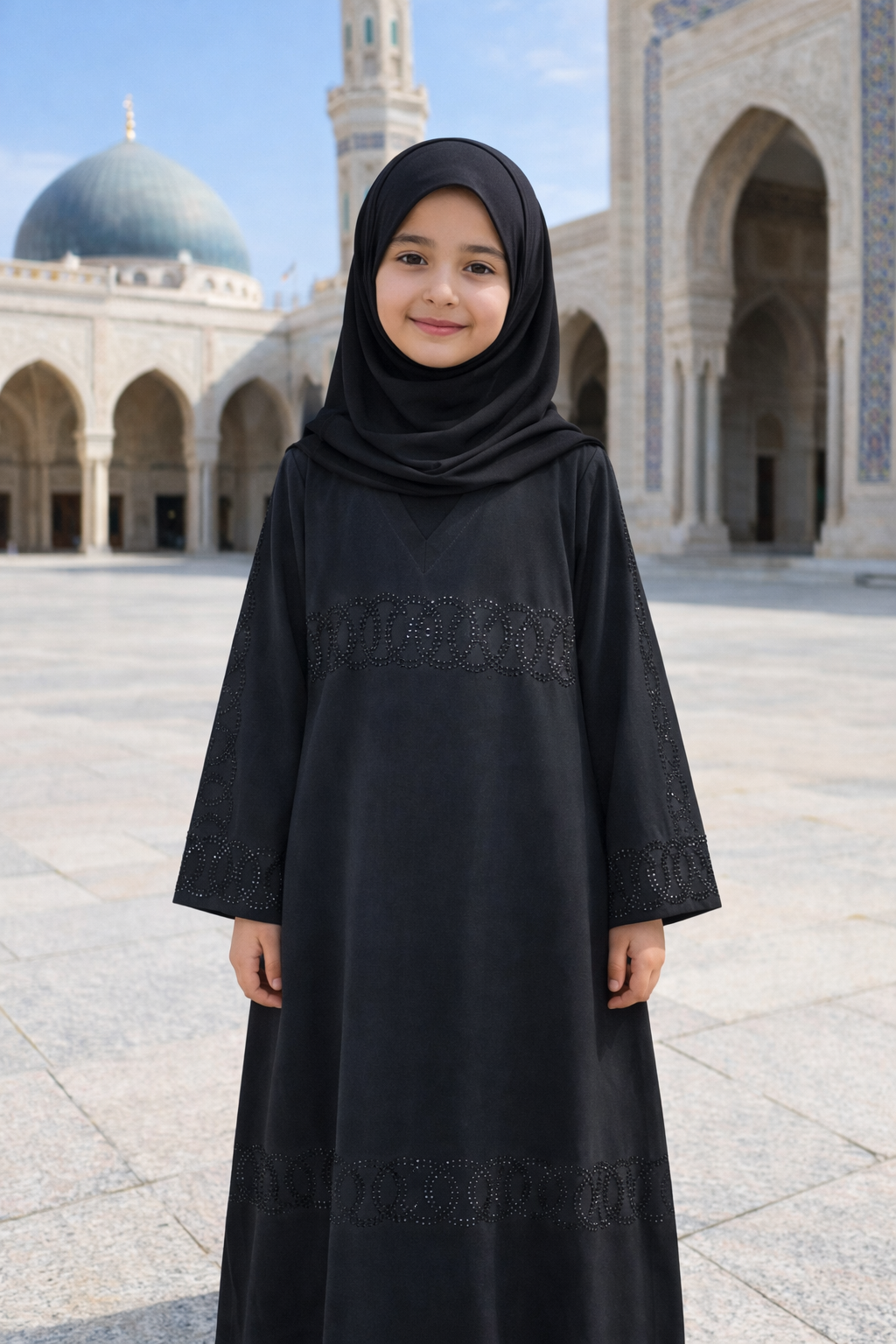 A beautifully designed girls’ abaya featuring premium stone work that enhances its overall appeal. The modest silhouette and soft fabric make it perfect for Eid, weddings, and special celebrations.