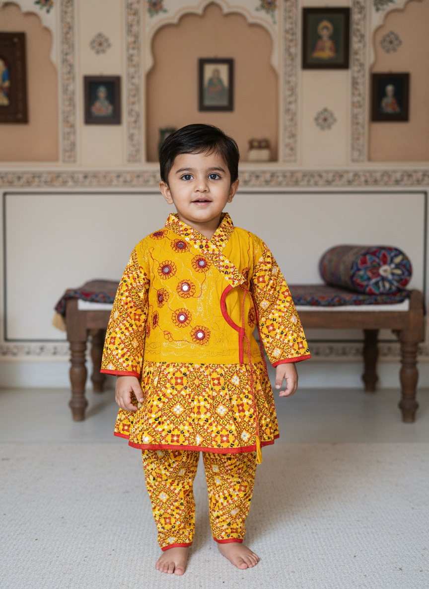 Dress your little one in vibrant Rajasthani charm with this beautiful traditional outfit. Featuring a bright yellow kurta-style top with intricate floral and mirror-inspired prints, this set is paired with matching bottoms for a complete ethnic look. The wrap-style neckline with contrast piping adds an authentic touch, while the soft, breathable fabric ensures all-day comfort for your infant. Perfect for festivals, weddings, cultural celebrations, and special occasions.