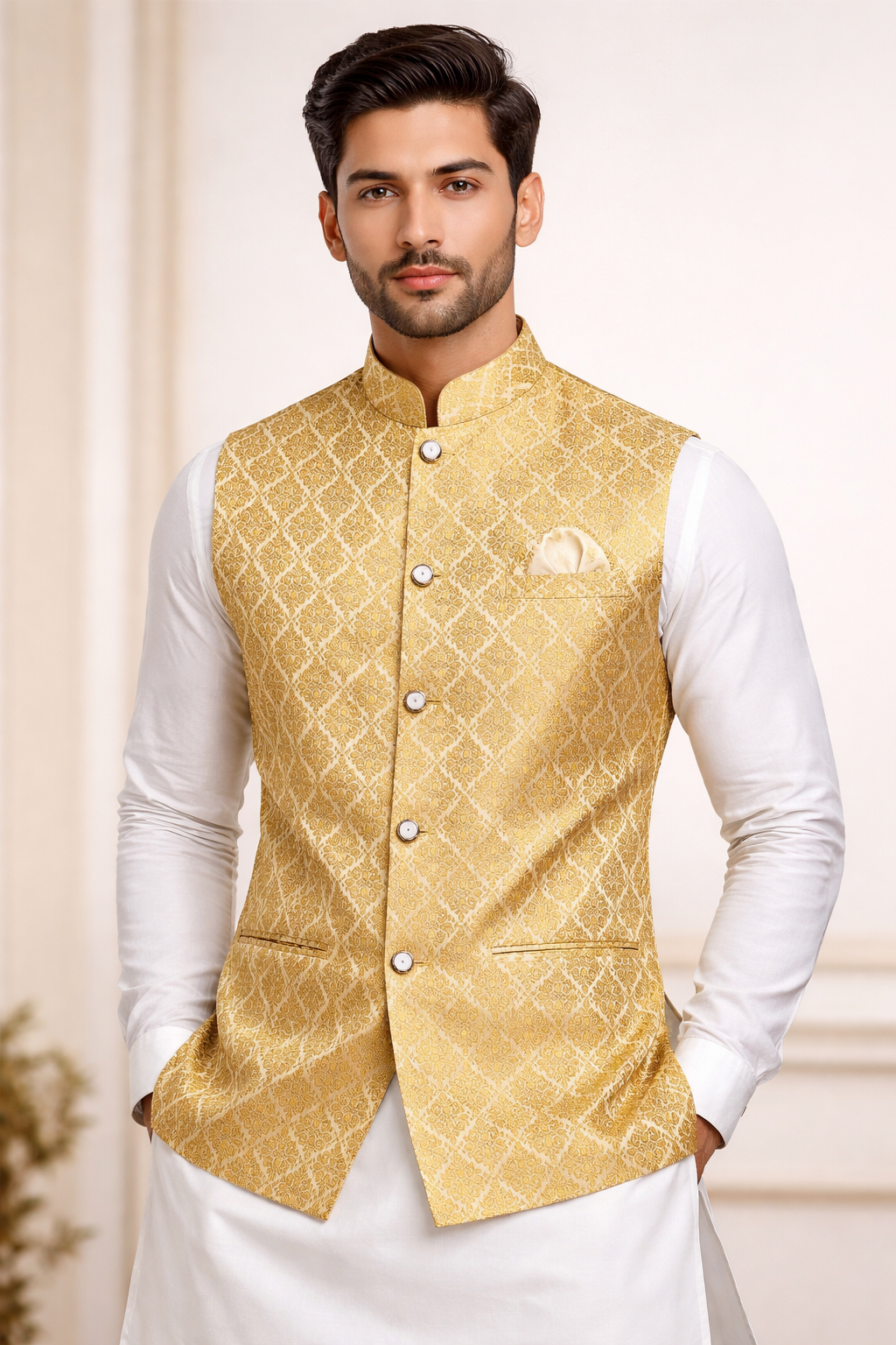 Elevate your traditional look with this elegant men’s Nehru vest, crafted from premium brocade fabric in a rich gold tone. Featuring an intricate diamond-pattern weave, this sleeveless jacket offers a refined and luxurious finish. Designed with a classic mandarin collar, front button closure, and functional pockets, it pairs perfectly with a white kurta or dress shirt for weddings, festive occasions, and formal gatherings. A timeless piece that blends tradition with modern sophistication.