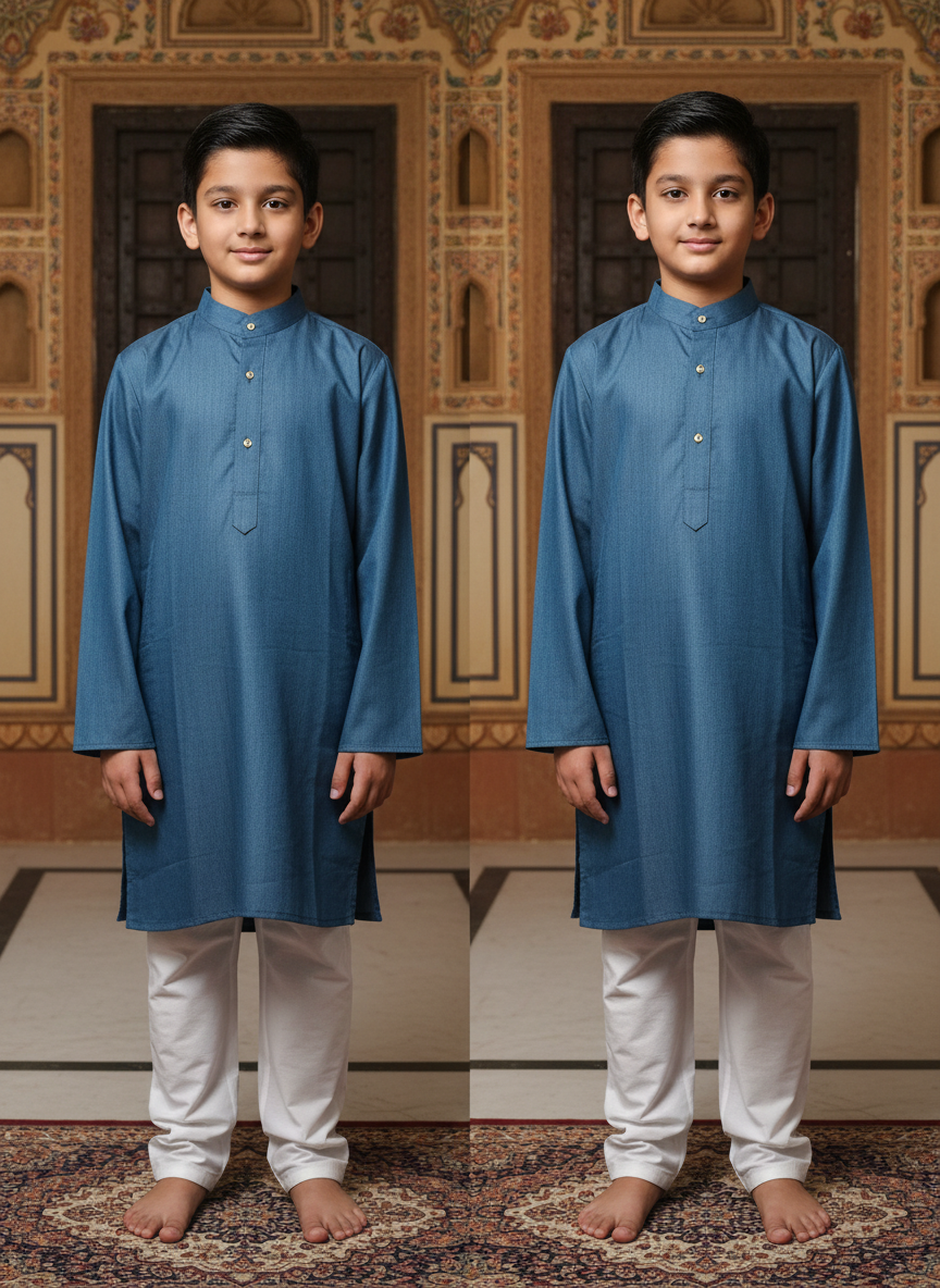 Ready-made full sleeves blue mandarin neck kids cotton kurta . Available with a white color cotton pajama.