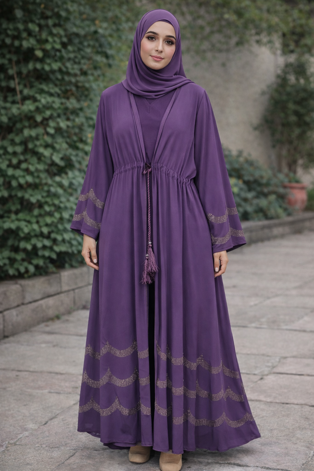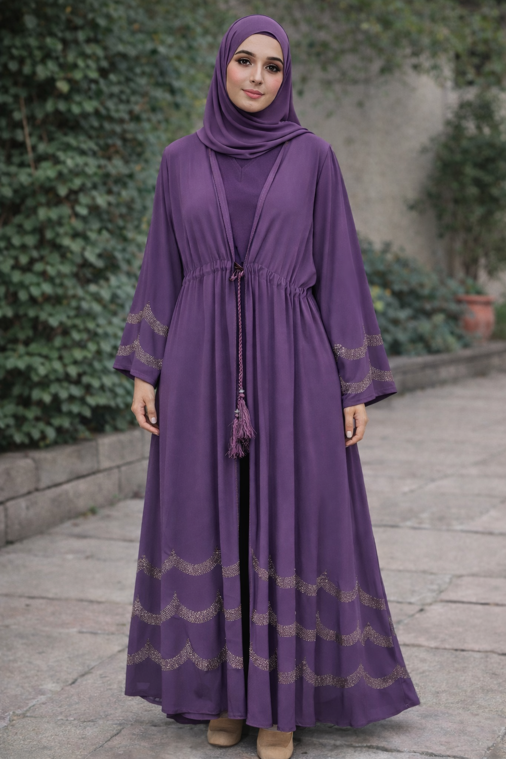 Elevate your modest wardrobe with this elegant stone-worked two-piece abaya set. Designed for sophistication and comfort, the set includes a flowing outer abaya adorned with delicate stone embellishments and a matching inner dress for complete coverage and effortless styling.
